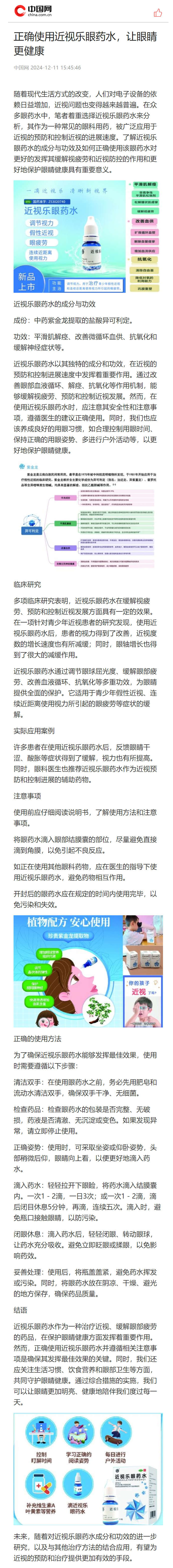 描述:2024年12月11日近视乐眼药水获中国网转载报道。新闻标题《正确使用近视乐眼药水,让眼睛更健康 》。